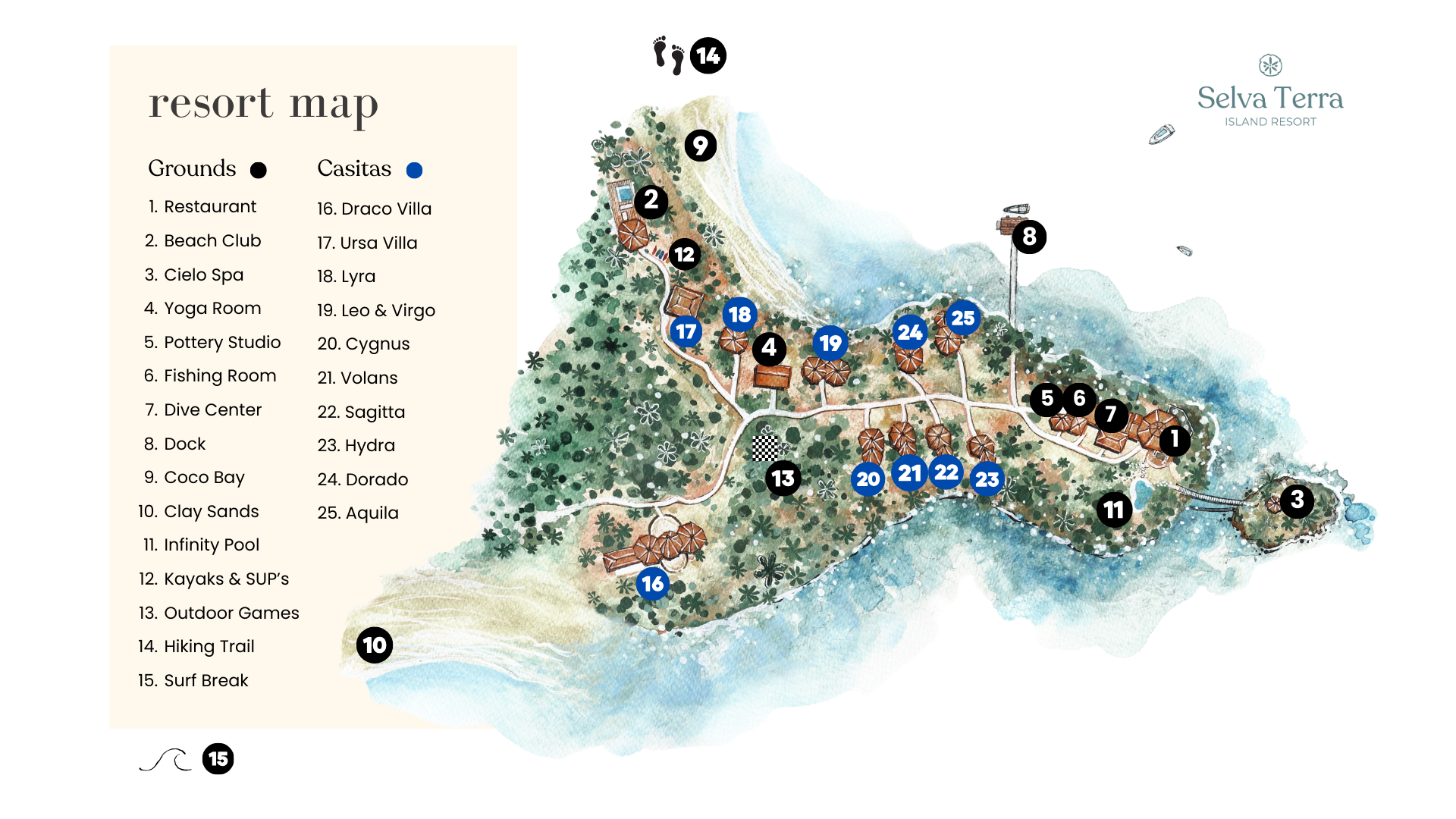 Selva Terra is luxury beachfront resort, with access to several beaches by foot or kayak. Three beaches stand out and are most frequently visited by our guests, each of them offering their own kind of magic.